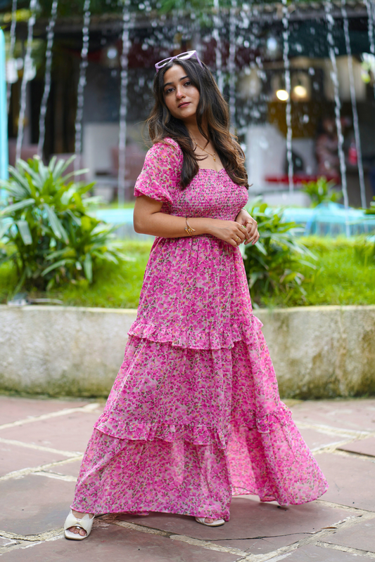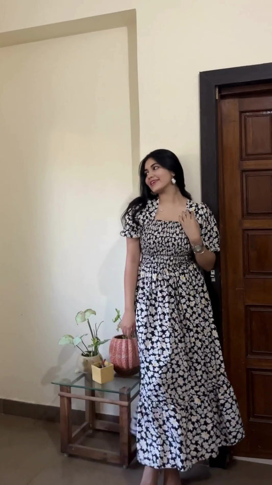 Elegant Floral Print Maxi Dress with Puff Sleeves